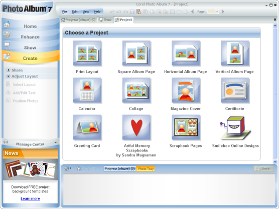 Вниманию пользователя предлагается целых 17 способов поделиться своими работами с друзьями и близкими. Пакет Photo Album предлагает все необходимое для быстрого создания плакатов, подарков и фотографий на память – от шаблонов печати до мастера создания дисков QuickCD. Возможности практически бесконечны!