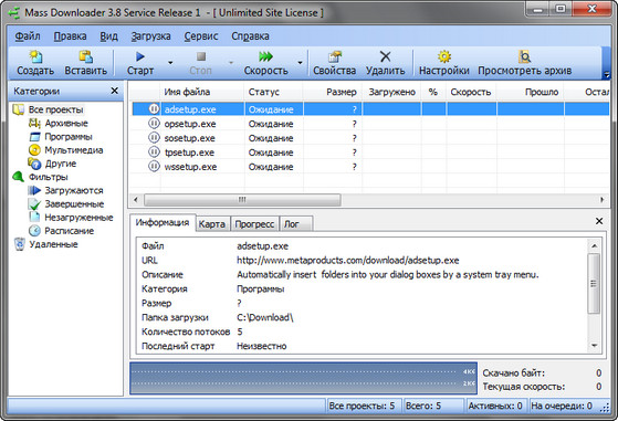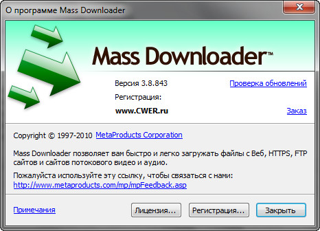 MetaProducts Mass Downloader - программа для удобного скачивания файлов из Интернета по протоколам HTTP и FTP, созданная на базе Offline Browser, разница только в том, что менеджер закачки загружает указанные пользователем файлы, а оффлайн-браузер - все файлы сайта. Программа разбивает закачиваемый файл на части и качает все части одного файла одновременно, тем самым увеличивая скорость. Может автоматически соединиться с провайдером, закачать файл и отключиться. Также позволяет докачивать файл после разрыва соединения (при условии, что сервер поддерживает докачку). Поддерживаемые протоколы HTTPS, FTP, RTSP, MMS, MMST и PNM. Имеется интеграция с веб браузерами Internet Explorer, Opera, Netscape Navigator, Mozilla, Firefox, Seamonkey и Flock. Программа имеет многоязычный интерфейс, включая русский язык и поддерживает работу с Windows Vista.