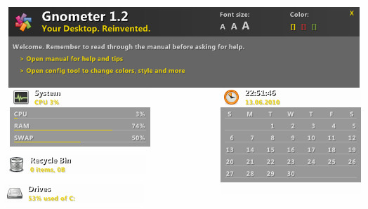 Rainmeter is a desktop customization platform. Through Rainmeter, you can enhance your Windows computer at home or work with skins: handy, compact applets which float freely on your desktop, much like Windows Sidebar gagdgets, or dashboard widgets for the Mac.