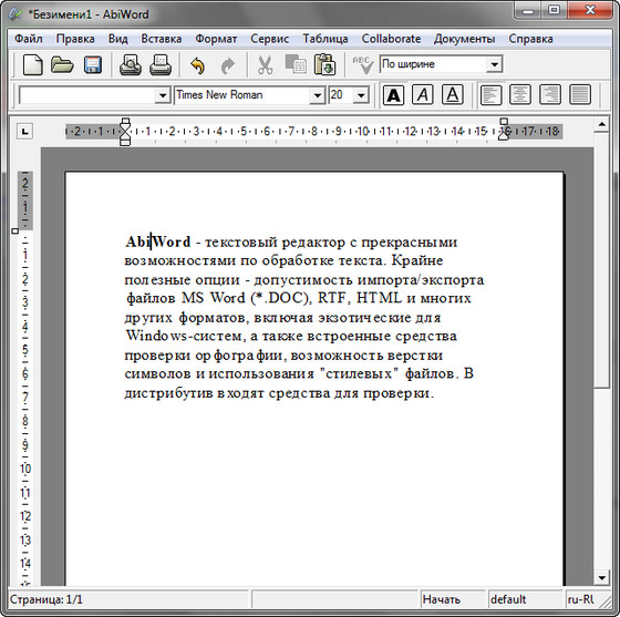AbiWord - текстовый редактор с прекрасными возможностями по обработке текста. Крайне полезные опции - допустимость импорта/экспорта файлов MS Word (*.DOC), RTF, HTML и многих других форматов, включая экзотические для Windows-систем, а также встроенные средства проверки орфографии, возможность верстки символов и использования "стилевых" файлов. В дистрибутив входят средства для проверки.