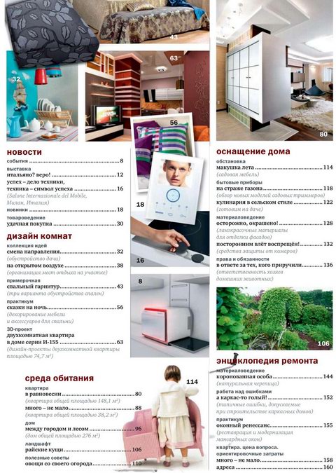 Издание предлагает максимум самой полезной и интересной информации, способной помочь каждому при обустройстве своего жилого пространства. Существенной составляющей журнала является то, что в нем можно найти основные потребительские характеристики товаров для дома и цены на строительные и отделочные материалы, оборудование, сантехнику, бытовую технику, расценки на строительные работы, а также стоимость мебели, предметов декора и многих других вещей, делающих жильё более комфортным.