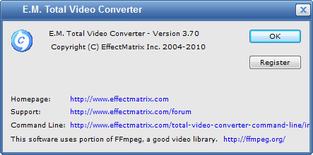 E.M. Total Video Converter - это очень мощная программа, которая позволяет конвертировать любые видеофайлы в форматы 3gp (формат мобильных телефонов и наладонников), mp4, psp, iPod, swf, flv, DVD, VCD. Total Video Converter поддерживает чтение и проигрывание большого количества видео и аудио форматов (3gp, mp4, psp, iPod, swf, flv, DVD, VCD, mp3, ac3, ogg, wav, aac...), а также конвертирует их в популярные video/audio форматы и форматы мобильных телефонов и наладонников. Присутствует возможность извлечения аудио из видеотреков и сохранение в mp3, ac3, ogg, wav, aac.