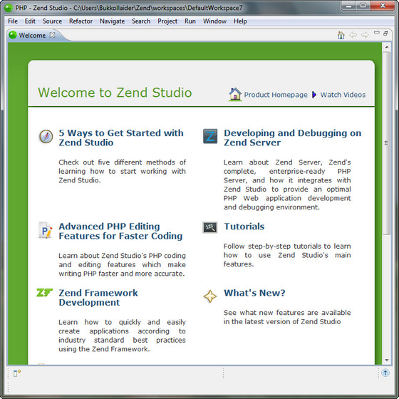 Zend Studio - профессиональная среда для разработки и отладки веб-проектов. Отличительной особенностью программы является возможность удаленной отладки и профайлинга. Отметим, что для удаленной отладки требуется установить Zend Studio Server, который представляет собой серверный модуль. В состав Zend Studio в качестве опции входит пакет PHP вместе с обширным списком предварительно скомпилированных расширений. Если у вас уже установлена предварительно сконфигурированная версия PHP, продукт Zend Studio легко интегрируется с ней. Также в пакет среды входит Zend Optimizer, являющийся серверным модулем для запуска закодированных с помощью Zend Encoder и Zend SafeGuard Suite скриптов, а также немного их ускоряющий. В седьмой версии Zend Studio появилась поддержка PHP 5.3, интеграция с Zend Framework и Zend Server, улучшено редактирование исходного кода и различные улучшения производительности программы.