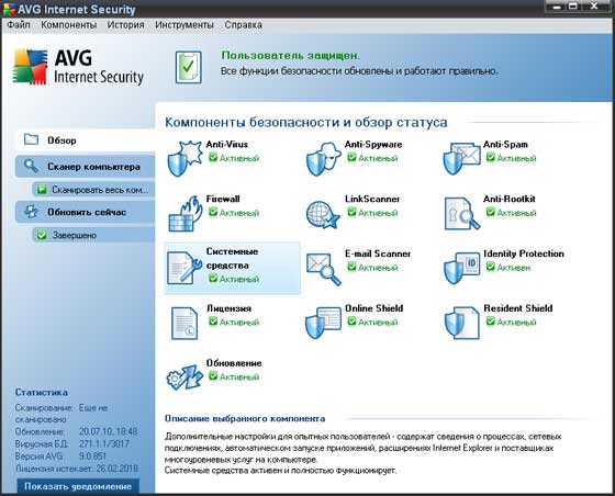 AVG Internet Security - комплексная защита компьютера от всех видов вредоносных программ, включающая в себя, антивирус, антишпион, защиту от спама, фишинга, утечки данных и файрвол, есть возможность автоматического обновления через интернет и работы по расписанию. Система безопасности AVG сертифицирована главными независимыми сертификационными компаниями, такими как VB100, ICSA, Virus Bulletin, Checkmark.
