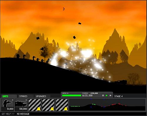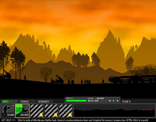 На вкладке Units расположены кнопки для создания солдат и военной техники, Strikes - ракетные и артиллерийские удары, Upgrades - улучшения которые позволяют использовать более разрушительное оружие. Не подпускайте врагов к левой границе экрана, иначе будете терять жизни.