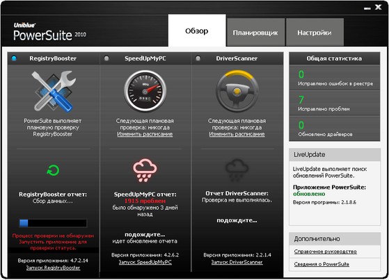 Uniblue PowerSuite 2010 - является полным решением для повышения производительности компьютера. Слияние RegistryBooster, DriverScanner и SpeedUpMyPC в рамках единого интерфейса, PowerSuite повышает и защиту уязвимых групп, но очень важных элементов системы привязаны к скорости и стабильности.