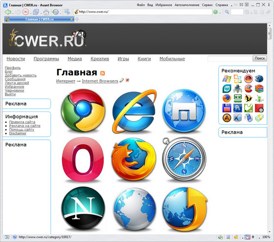 Avant Browser - браузер на основе Internet Explorer для расширения опций браузера и повышения комфортности интернет-серфинга, с отображением всех открытых веб-страниц в одном многовкладочном окне, автозакрытием рекламных окон, быстрым отключением / включением загрузки графики, удобным удалением временных интернет-файлов, интеграцией с поисковиком Google, скинами и сменными кнопками, подключением средней кнопки мыши, управлением мышью и т.д. Интерфейс меняется скинами (с домашней страницы можно скачать программку для создания своих собственных скинов).