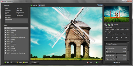Topaz DeNoise - является одним из передовых инструментов шумоподавления. Плагин использует несколько алгоритмов обработки изображения в зависимости от формата исходного материала, имеет несколько уровневую систему корректировки изображения - что несомненно даст возможность профессионалам оценить все прелести данного плагина.