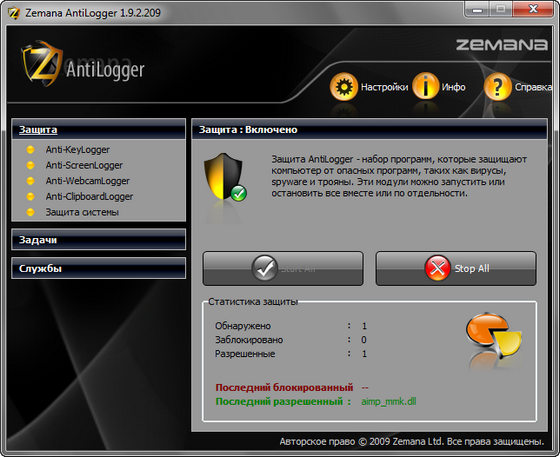 Zemana AntiLogger - мощный программный комплекс для защиты вашего ПК от наиболее опасных сетевых угроз, таких как KeyLoggers, ScreenLoggers, WebCamLoggers, ClipboardLoggers. Помимо обеспечения безопасности от вышеуказанных вредоносных программ, программа защищает доверенные компоненты системы от нежелательного доступа, например, инжекция dll/code, загрузка драйвера ядра, изменение физической памяти и т.д. Программа совместима со всеми популярными антивирусами и совершенно не влияет на производительность системы.