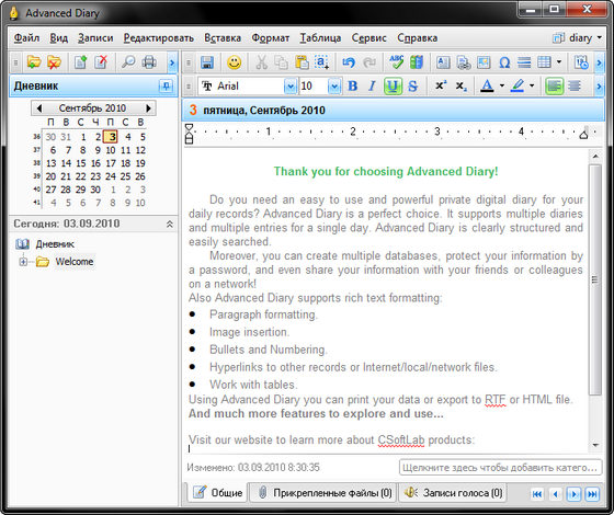 Advanced Diary - программа для ведения ежедневных записей с возможностью одновременного ведения нескольких дневников. Особенности: удобный интерфейс, простая навигация и поиск записей, а также возможность создания ссылок на имеющиеся записи. Для удобства работы поддерживается два режима: Календарь и Дерево документов.