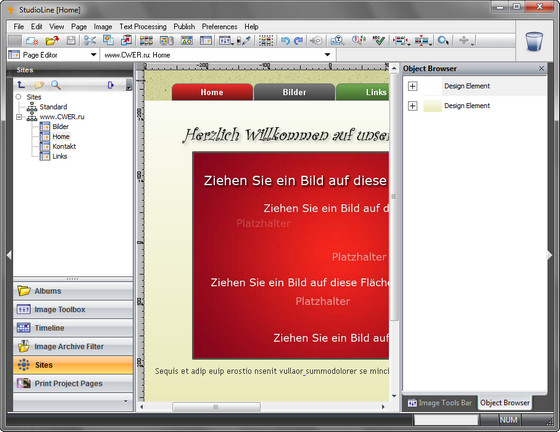 Разработчиком была предусмотрена возможность свободного размещения текстовых и графических элементов в рамках странички, а также реализовано наличие интегрированного графического редактора, при помощи которого можно работать с растровыми и векторными изображениями, применяя к ним имеющиеся фильтры и эффекты. Более того, присутствует богатая библиотека готовых шаблонов, которые успешно могут быть использованы в качестве основы будущего проекта.