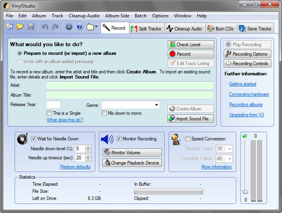 Для работы с программой необходим персональный компьютер, оснащенный звуковой картой, и проигрыватель грампластинок (поддерживаются современные модели проигрывателей с интерфейсом USB ) или портативный кассетный магнитофон. Начинающие пользователи по достоинству оценят наличие подробных пошаговых инструкций по подключению проигрывателя к ПК.