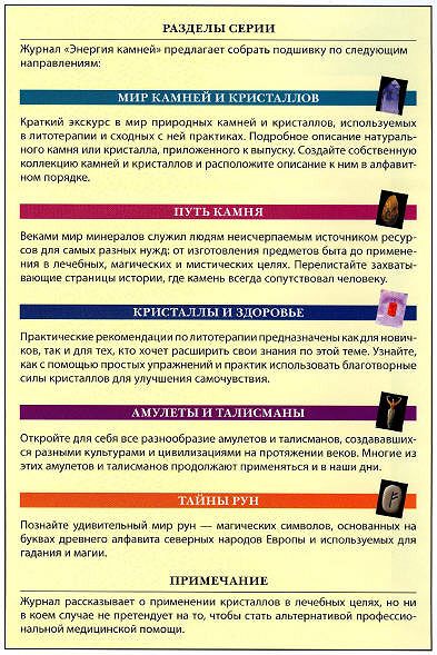 С незапамятных времен натуральные камни и кристаллы высоко ценились за свои лечебные свойства. Теперь у вас есть возможность использовать свойства и энергию камней, чтобы обеспечить хорошее состояние вашего тела, разума и духа. Соберите прекрасную коллекцию натуральных камней и кристаллов, которые были отобраны в соответствии с их полезными свойствами и огранены таким образом, чтобы усилить их энергетику.