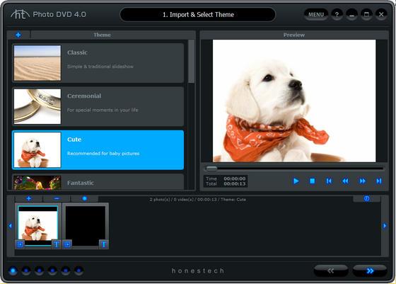 honestech Photo DVD - программа поможет создать из Ваших фотографий полноценное слайд шоу с использованием фоновой музыки и различных эффектов. В программе есть возможность записать созданное слайд-шоу на диск, поддерживаются все CD и DVD форматы.