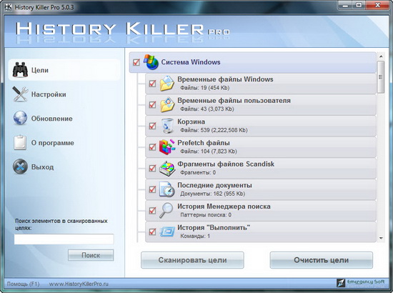 Этот удобный инструмент стирает временные файлы и директории Windows, мусорную корзину, историю поиска Windows, список последних используемых файлов Windows продуктов Windows и программ Microsoft Office, а также временные файлы, историю, формы автозаполнения и cookies Internet Explorer, Mozilla Firefox, Opera и Google Chrome. И с помощью планировщика задач History Killer Pro можно все эти действия автоматизировать.