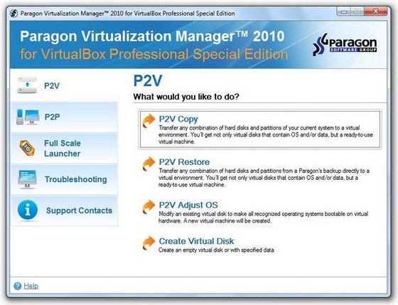 Paragon Virtualization Manager 2010 Professional for VirtualBox - создан специально для пользователей Oracle VirtualBox. Программа с легкостью переносит компьютер на ОС Windows в виртуальное окружение (P2V) и наоборот (V2P). Вы сможете работать с виртуальными дисками из удобного интерфейса программы Virtualization Manager даже без запуска виртуальной машины. Мигрируйте с одного виртуального окружения на другое (V2V), передавайте данные с физической системы на виртуальную, работайте с разделами и многое другое.