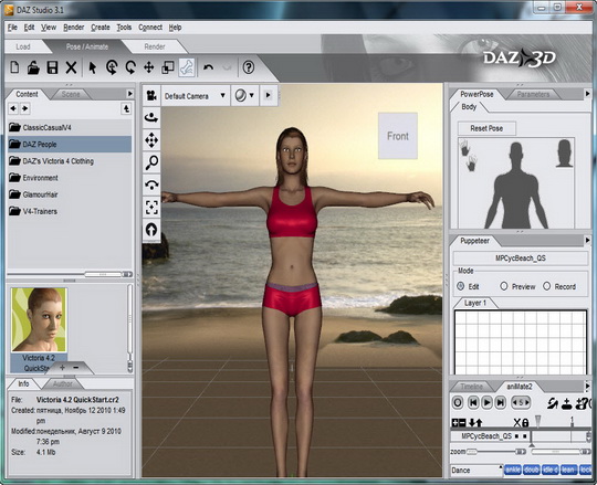 DAZ Studio – программа, представляющая собой расширенную версию популярного набора инструментов, предназначенного для подготовки качественной трехмерной графики и анимации. Дает пользователям возможность оценить дополнительные способы рендеринга изображений и расширенную поддержку шейдеров. Кроме всего прочего, Daz Studio предоставляет возможность импорта и экспорта моделей в формат Collada, а также предлагает средства для редактирования ключевых кадров анимации и превосходный инструмент Figure Mixer.
