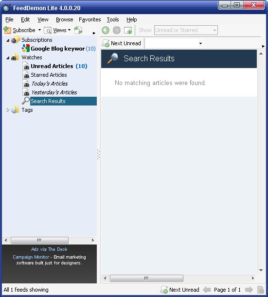- Watches: Tell FeedDemon to let you know when your keywords appear in any feed you’re subscribed to.