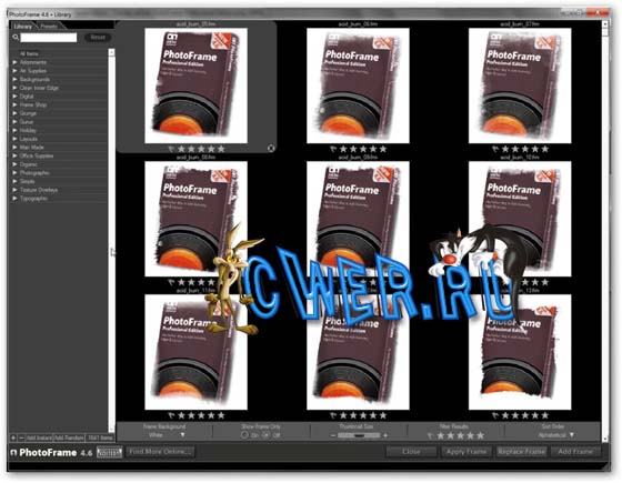 PhotoFrame Pro - наверное, самый простой путь для создания рамки для Вашего фото. Доступны тысячи вариантов рамок, которые можно скачать из онлайн-галлереи на сайте производителя. Встроенный мастер поможет подобрать оптимальную для Вашего фото рамку, в т.ч. в автоматическом режиме. Этот же мастер позволит сделать предпросмотр фото с несколькими рамками одновременно. Ну и множество красивых эффектов для Ваших фото.