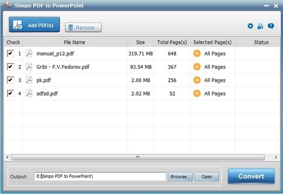 The interface of Simpo PDF to PowerPoint Converter is simple and friendly. Even if a computer beginner can convert PDF to PowerPoint effortlessly with it, just add PDF files, click "Convert" button, done! - Convert PDF to PowerPoint Presentations Precisely
