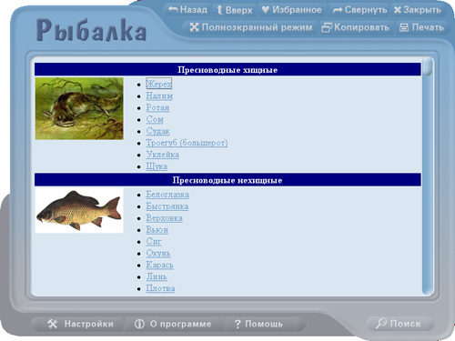 Подробные исчерпывающие описания рыб и их повадок пригодятся начинающим рыбакам для рыбалки. Тонкости рыбалки в зависимости от времени года. Рыбацкие термины и разные рецепты рыбацких блюд тоже придутся к стати для многих. Скачивайте Рыбалка исчерпывающее руководство и повышайте свой опыт, чтобы рыбалка была успешнее.