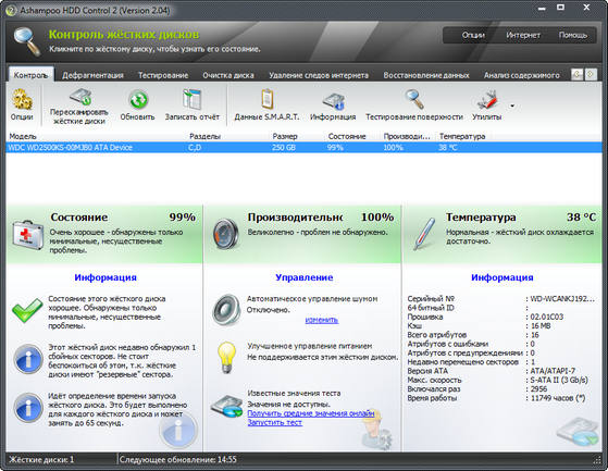 Ashampoo HDD Control - программное обеспечение для контроля за состоянием жестких дисков. Выполняет обслуживание жесткого диска для Вас. Позволяет предотвратить потенциальные отказы и аварии прежде, чем они произойдут. Программное обеспечение поддерживает жёсткие диски типа IDE и последовательные ATA. Ashampoo HDD Control предоставляет пользователю все важные факты и информацию о дисководе, включая регистрационный номер, версию БИОСА (прошивки), размер кэша, количество разделов, на которые разбит хард, свободном месте на диске и текущей температуре.