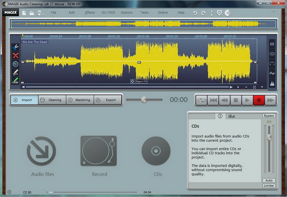 MAGiX Audio Cleaning Lab - мощный пакет для компилирования, чистки и управления звуковыми данными любого вида. Позволяет использовать источники звука различных типов: от магнитной ленты и пластинок до MРЗ. Дает возможность создавать компиляции с наложением высококачественных эффектов, очисткой и последующей записью. С помощью этой программы можно очистить звук от треска, щелчков и шумов, а также записать очищенные данные на CD, защитив их тем самым от дальнейшего износа. Программа имеет множество алгоритмов очистки, а также компрессор, эквалайзер, расширитель стереобазы и другое. Позволяет подключать внешние DirectX плагины. Имеет удобный пользовательский интерфейс и простое управление.