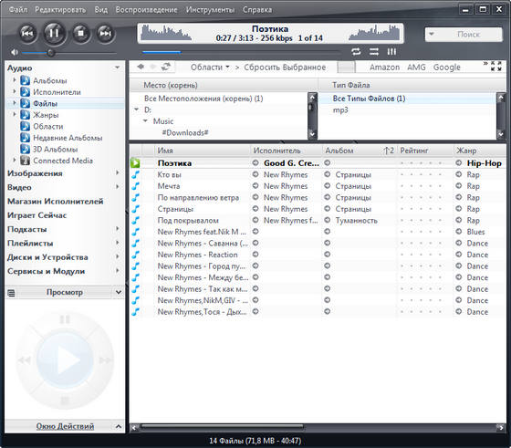 J.River Media Center - мультимедийный центр. Проигрывает большинство популярных аудио и видео форматов, включая MP3, аудио CD и DVD, может преобразовывать CD-аудиотреки в WAV и MP3, переписывать на жесткий диск виниловые диски и кассеты, а также создавать аудио-CD, причем для всех этих функций программа имеет множество настраиваемых параметров. Кроме этого, есть очень хороший и мощный по своим возможностям органайзер мультимедийных файлов, медиаредактор, эквалайзер, встроенный DSP и удобный планировщик заданий для автоматизации процессов проигрывания/записи, а также поддержка пульта ДУ. Из необязательных, но приятных функций - становящаяся уже почти стандартом для "приличных" программ возможность изменения внешнего вида с помощью скинов, мини-режим проигрывателя и "телевизор".
