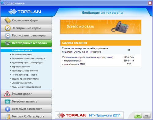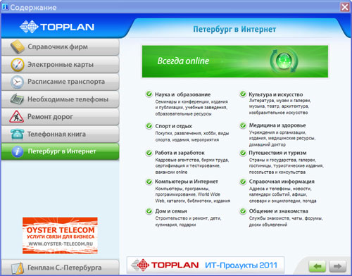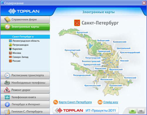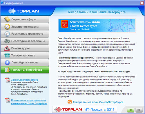 Самое полное и качественное электронное справочное издание о Санкт-Петербурге, содержащее актуальную информацию о 70000 предприятий и организаций, а также подробную электронную векторную карту города.