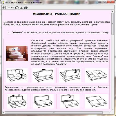 Мы поможем создать идеальное настроение для вашего дома. На диске содержатся рекомендации по подбору и размещению мебели. Также рассмотрены характеристики основных видов обивочных тканей, кожи, древесины, предложены советы по уходу за мебелью. Вы сможете посмотреть фотогалерею продукции ведущих мировых производителей мебели, которая познакомит вас с тенденциями современной мебельной моды и новинками рынка.