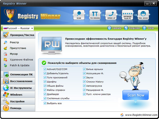 Registry Winner – программа для улучшения работы компьютера, которая находит ошибки, оптимизирует систему и ускоряет ее. Вы можете столкнуться с различными проблемами, которые постепенно появляются с использованием компьютера, например, замедление, зависание, «голубой экран смерти», постоянные сообщения об ошибках и т.д. Registry Winner использует только самые продвинутые технологии для сканирования ваших жестких дисков и дает вам наиболее полную диагностику всего за несколько секунд. Как только проблемы обнаружены приложением, Registry Winner предложит вам профессиональное и высокоэффективное решение для вашего компьютера.