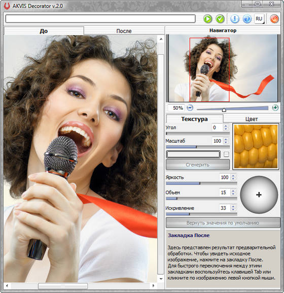Как и прочие программы AKVIS, Decorator обладает простым и удобным в использовании интерфейсом, понятным даже новичку в компьютерной графике. Подсказки в нижней части окна, а также возможность переключаться одним кликом мыши между состояниями До и После помогут вам подобрать наилучший вариант. Предлагаем также воспользоваться встроенным учебником (Help) и посетить наши онлайновые уроки по работе с программой.