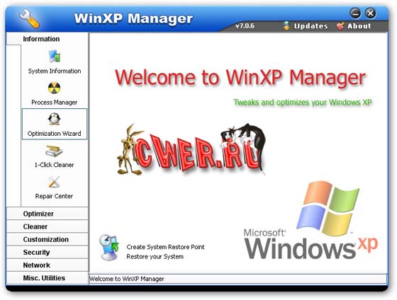 WinXP Manager - программа для настройки и оптимизации операционной системы. Содержит около трех десятков разнообразных утилит, которые позволяют получить доступ к нескольким сотням скрытых опций для настройки операционной системы. С ее помощью можно попытаться улучшить быстродействие Windows, улучшить настройки безопасности, произвести очистку реестра, удалить мусорные файлы, ускорить передачу данных по сети и через Интернет. Кроме этого, программа дает возможность создать резервную копию данных для почтового клиента Outlook Express, автоматически проверить неработающие ссылки в "Избранном" и прочее. Для неопытных пользователей программа предлагает удобный мастер настройки.