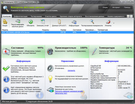 • Информация о серийных номерах, производителе, кеше, плохих секторах на вашем жестком диске