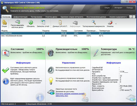 Ashampoo HDD Control - программное обеспечение для контроля за состоянием жестких дисков. Выполняет обслуживание жесткого диска для Вас. Позволяет предотвратить потенциальные отказы и аварии прежде, чем они произойдут. Программное обеспечение поддерживает жёсткие диски типа IDE и последовательные ATA. Ashampoo HDD Control предоставляет пользователю все важные факты и информацию о дисководе, включая регистрационный номер, версию БИОСА (прошивки), размер кэша, количество разделов, на которые разбит хард, свободном месте на диске и текущей температуре.