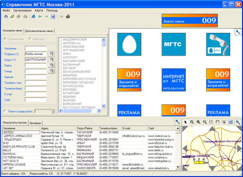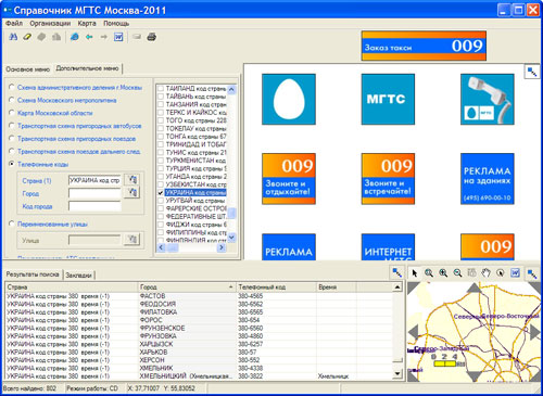 В его базе данных отражены все последние изменения, связанные с реконструкцией ОАО МГТС и введением в эксплуатацию новых телефонных номеров, а также переводом их значительной части в код 499. Дружественный интерфейс, простота навигации, понятная поисковая система обеспечивают удобство поиска и получения информации. На диске содержится усовершенствованная векторная интерактивная карта с расширенными возможностями по изменению слоев, с функцией поиска объекта в радиусе. Среди достоинств диска – возможность определения по карте маршрута между выбранными объектами, с указанием времени и расстояния, наличие обновленных транспортных схем пригородных поездов и автобусов с возможностью импортирования в графический редактор и вывода на печать. Пользователи смогут найти телефонный код по названию города и наоборот, переименованные улицы, узел связи/оператора, которому принадлежит телефонная станция, и многое другое.