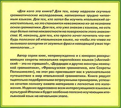 Для кого эта книга? Для тех, кому надоели скучные грамматические исследования, написанные трудным языком. Для тех, кто хотел бы изучить итальянский язык, но это невозможно из-за незнания основ грамматики. Для тех, кто уже знаком с языком, но есть еще белые пятна. И, наконец, для тех, кто просто хочет почитать что-нибудь об итальянском языке, но чтобы это чтиво не вызывало аллергии…