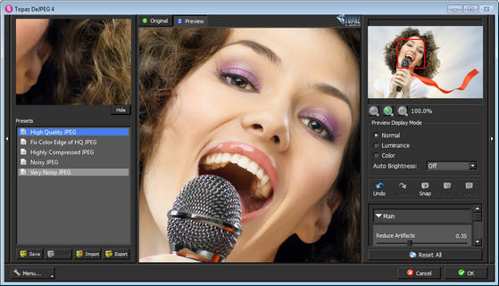 Topaz DeJPEG gives you the ability to improve the quality of your JPEG images. DeJPEG eliminates JPEG compression artifacts, which occur as a result of saving an image in the JPEG format, allowing you image detail and color to be restored.