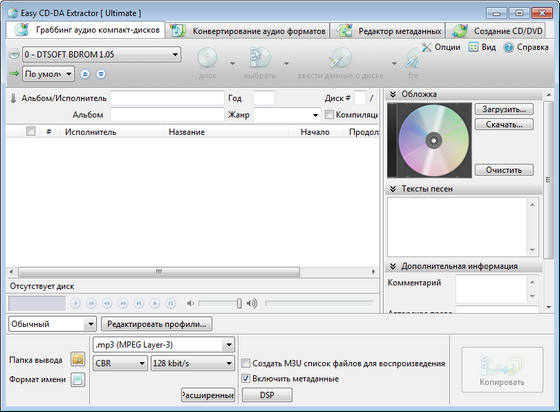 Easy CD-DA Extractor- программа для преобразования аудио-CD в качественные цифровые аудиофайлы, а также для записи MP3, WAV MP4, Windows Media Audio, FLAC, Ogg Vorbis, AAC и Monkey-s файлов на аудио-CD. Допускается преобразование аудиотреков непосредственно в MP3, WMA, VQF, OGG или WAV и конвертирование из одного аудиоформата в другой.