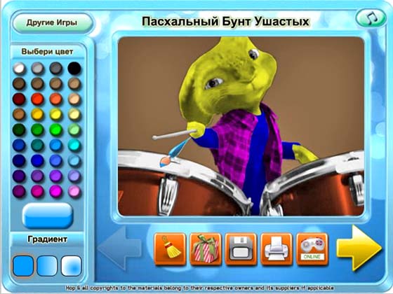 Вы уже наверняка слышали о предстоящей премьере нового фильма «Бунт Ушастых», посвященного религиозному празднику Пасхи. Сегодня у вас есть уникальная возможность познакомиться поближе с главным героем этого анимированного фильма, пасхальным зайцем Хопом. В новой игре-раскраске вы сможете не только посмотреть сцены из фильма, но и раскрасить их по вашему вкусу! Проявите ваши художественные способности и сделайте черно-белый мир Хопа цветным и прекрасным!