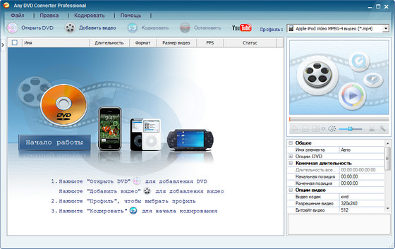 Any DVD Converter Pro – позволяет преобразовывать видео среди форматов AVI, MPEG, WMV, DivX, RM, MOV, 3GP, XviD, VOB и др. Помимо этого, программа обладает функцией риппера, которая позволяет копировать DVD-диски. Кроме того, Any DVD Converter Pro поддерживает пакетное преобразование файлов.