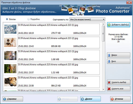 Ashampoo Photo Converter это идеальный инструмент для редактирования сотни фотографий. В один клик можно: настроить размер фотографий, поворот, автоматическую корректировку, сохранить в одном из нескольких новых форматов или защитить фотографии водяным знаком.