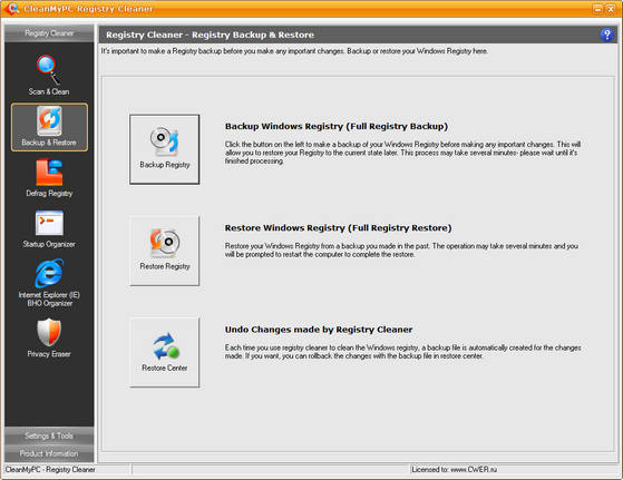 CleanMyPC Registry Cleaner сканирует системный реестр операционных систем Windows на предмет обнаружения и удаления некорректных, поврежденных или неработающих ссылок и записей. Данная процедура позволяет поддерживать работоспособность ОС на достаточно высоком уровне и избегать непредвиденных сбоев в работе ПК. Присутствует опция создания резервных копий реестра, так что вы всегда можете отменить все сделанные изменения и вернуться к наилучшей конфигурации. Также утилита позволяет с легкостью управлять программами и BHO (Browser Helping Object), автоматически загружаемыми в момент запуска Windows и Internet Explorer.