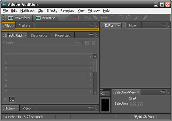 Мощный звуковой редактор для микширования, редактирования, создания мастер-копий и обработки аудиоэффектов. Поддерживается совмещенная работа с видео файлами. Можно просматривать фрагменты видеоролика в окне Multitrack View и работать с видео файлами в различных форматах, включая AVI, MPEG, Native Digital Video (DV) и Windows Media Video (WMV). Adobe Audition поддерживает более 20 популярных аудио форматов. Имеются встроенные средства записи компакт-дисков и всевозможные аудиоэффекты, гибкие и точные средства редактирования и предварительного прослушивания. Имеется огромная коллекция (насчитывается более 5000 фрагментов в различных жанрах) закольцованных музыкальных фрагментов (loop). Adobe Audition позволяет пользователям редактировать отдельные аудио файлы, создавать циклы, импортировать более 45 эффектов и микшировать до 128 дорожек.
