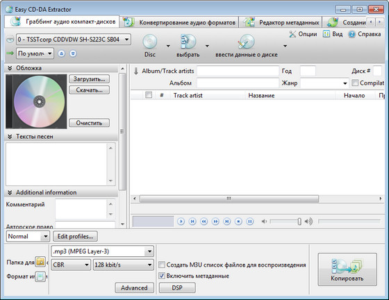 Easy CD-DA Extractor - программа для преобразования аудио-CD в качественные цифровые аудиофайлы, а также для записи MP3, WAV MP4, Windows Media Audio, FLAC, Ogg Vorbis, AAC и Monkey-s файлов на аудио-CD. Допускается преобразование аудиотреков непосредственно в MP3, WMA, VQF, OGG или WAV и конвертирование из одного аудиоформата в другой.