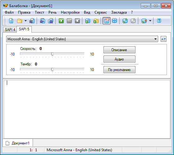 Текст может быть сохранен в вида аудиофайла (поддерживаются форматы WAV, MP3, OGG и WMA). Программа умеет работать с различными версиями пакета речевых функций Microsoft Speech API (SAPI). Он позволяет изменять скорость и тембр речи.