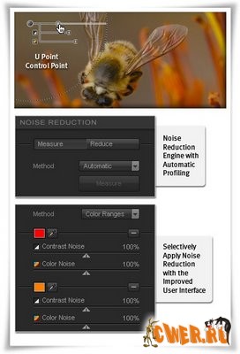 Новая, вторая, версия плагина отличается полностью измененным интерфейсом, а также наличием запатентованной технологии U Point, которая позволяет производить операции с изображением выборочно. Во-первых, у фотографов есть возможность указывать фрагменты, где действие фильтра будет более всего заметно, а во-вторых, пользователи могут отдельно управлять уменьшением цветового и яркостного шума.