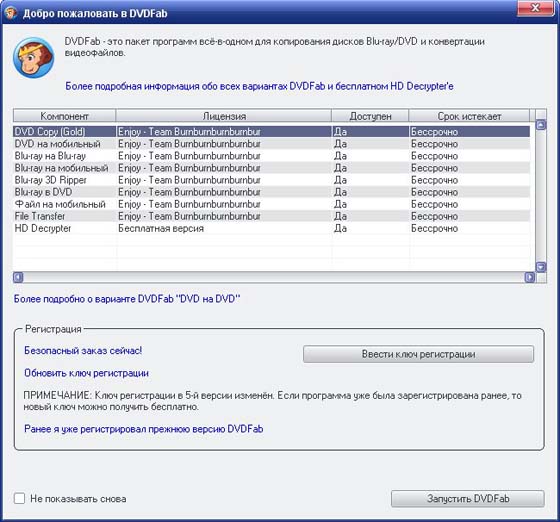 DVDFab – мощный, многофункциональный программный продукт для копирования DVD дисков с возможностями гибкой обработки видеопотока. Программа является одной из лучших на сегодняшний день, из инструментов для копирования, разбиения, пережатия и конвертирования DVD дисков с фильмами. Снимает все защиты и ограничения с диска и при желании пережмет диск большой емкости и вместит его в обыкновенную пустую DVD болванку с минимальными потерями качества (DVD9->DVD5) или разобъет фильм на два диска с полным переносом его меню, удалит всю рекламу, запишет только фильм и многое другое. Программа имеет интуитивно понятный, мультиязычный интерфейс включая русский.