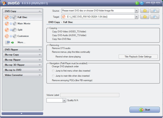 - 8 режимов копирования DVD на DVD:полный диск,основной фильм,разделение,переделывание,разделение по своему определению,клон,объединение и писать данные.