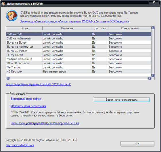 DVDFab – мощный, многофункциональный программный продукт для копирования DVD дисков с возможностями гибкой обработки видеопотока. Программа является одной из лучших на сегодняшний день, из инструментов для копирования, разбиения, пережатия и конвертирования DVD дисков с фильмами. Снимает все защиты и ограничения с диска и при желании пережмет диск большой емкости и вместит его в обыкновенную пустую DVD болванку с минимальными потерями качества (DVD9->DVD5) или разобьет фильм на два диска с полным переносом его меню, удалит всю рекламу, запишет только фильм и многое другое. Программа имеет интуитивно понятный, мультиязычный интерфейс включая русский.